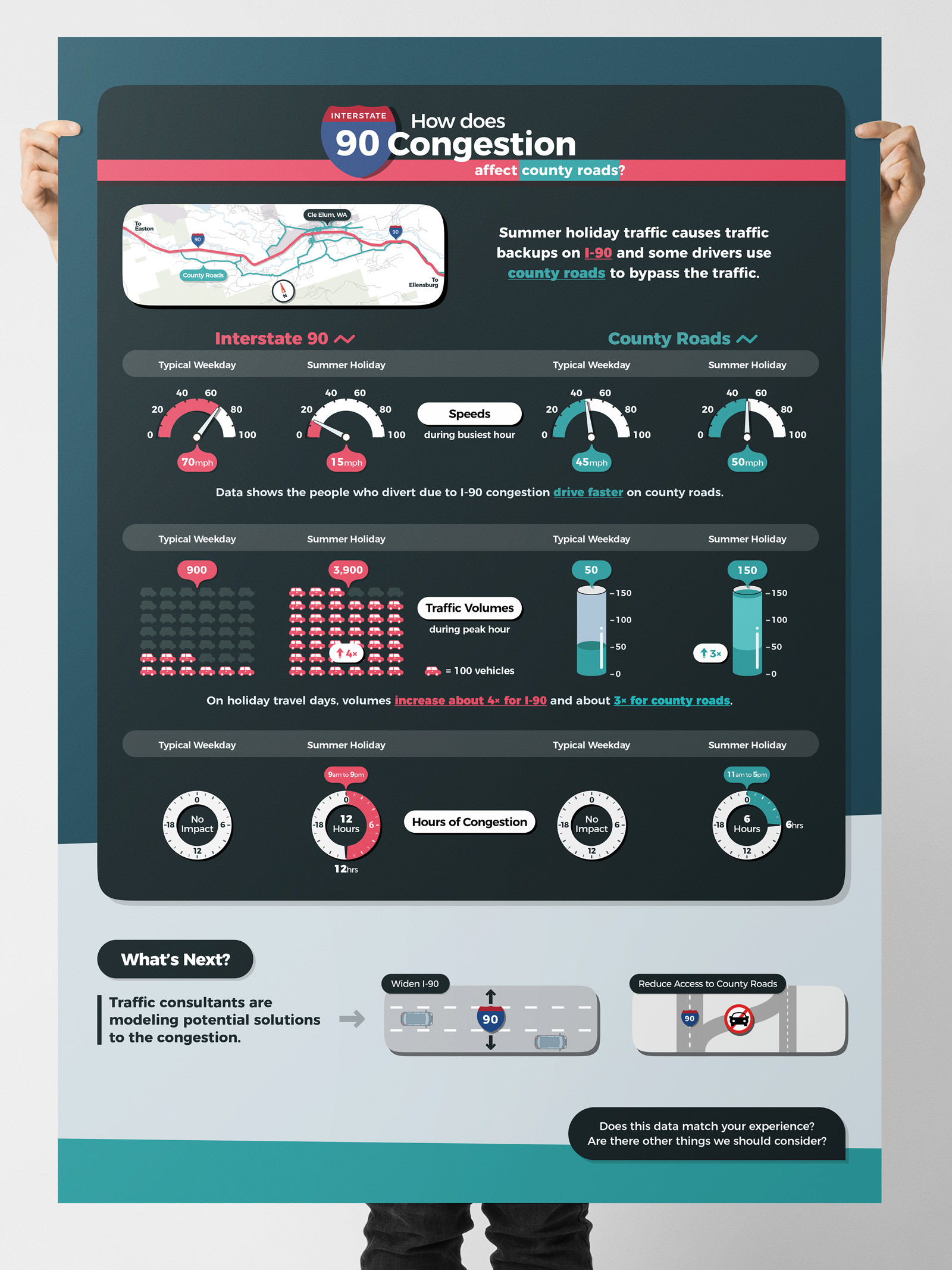 The project below examines how summer holiday traffic affects Interstate 90 and surrounding county roads. By comparing speeds, volumes, and congestion over time, the graphic reveals how increased demand on I-90 leads to diversion and localized impacts on adjacent road networks.
