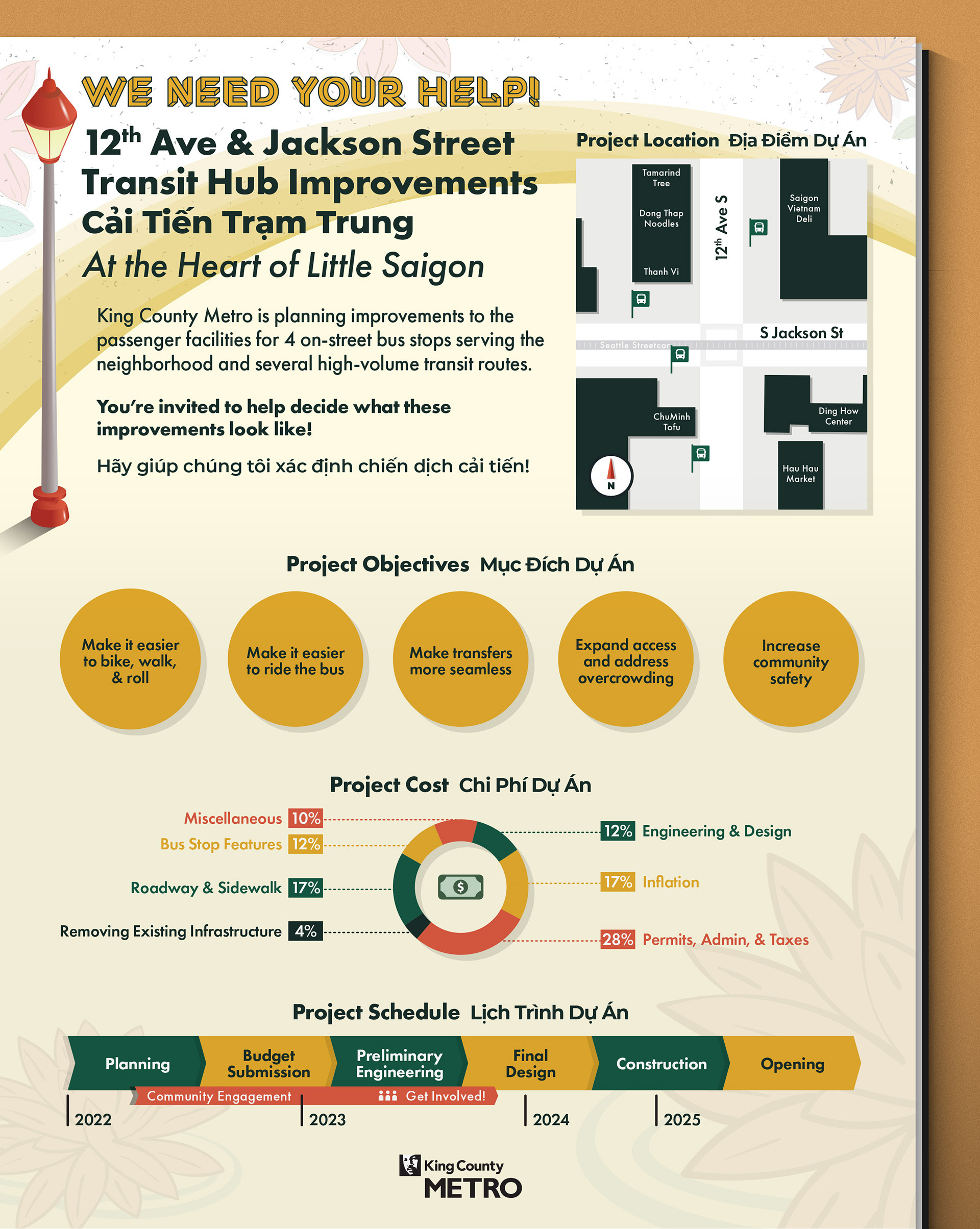 A bilingual outreach graphic designed to help the Little Saigon community understand and engage with proposed transit improvements.