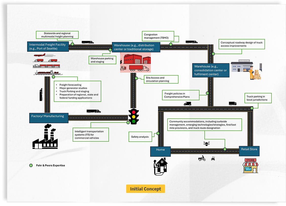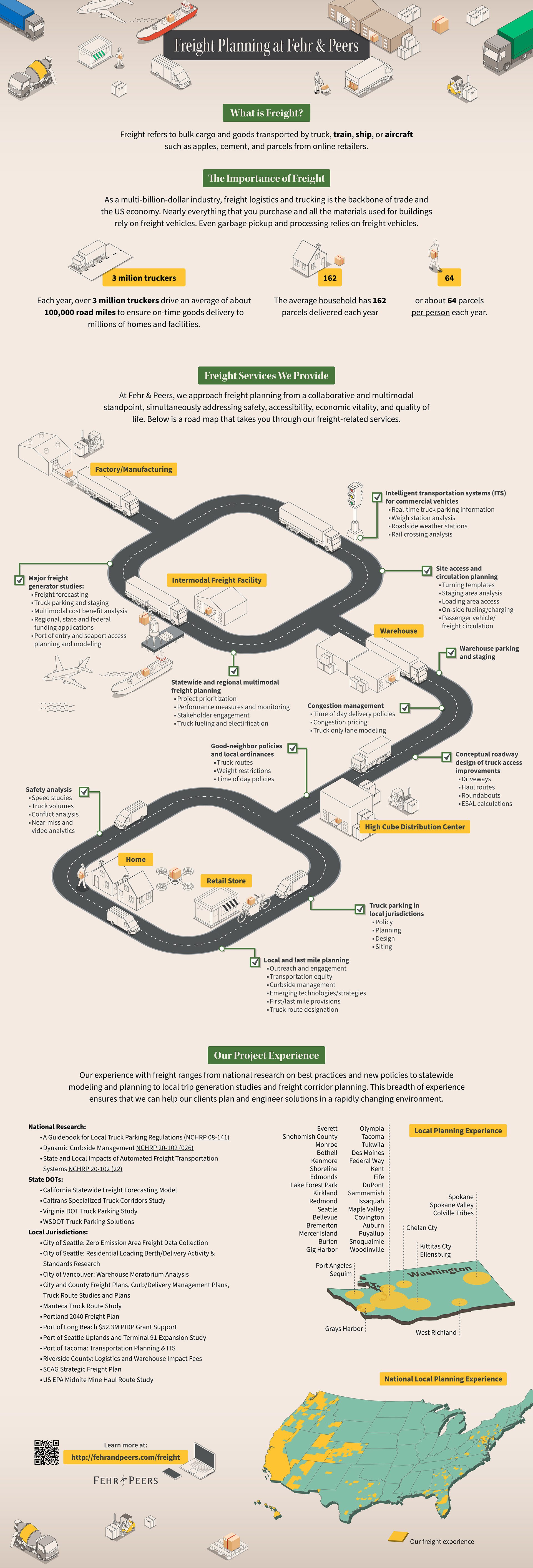 Freight systems involve a complex network of infrastructure, policies, and logistics that are often difficult to communicate to non-technical audiences. As lead designer, I collaborated with engineers and planners to translate freight planning concepts into a clear and engaging visual narrative.