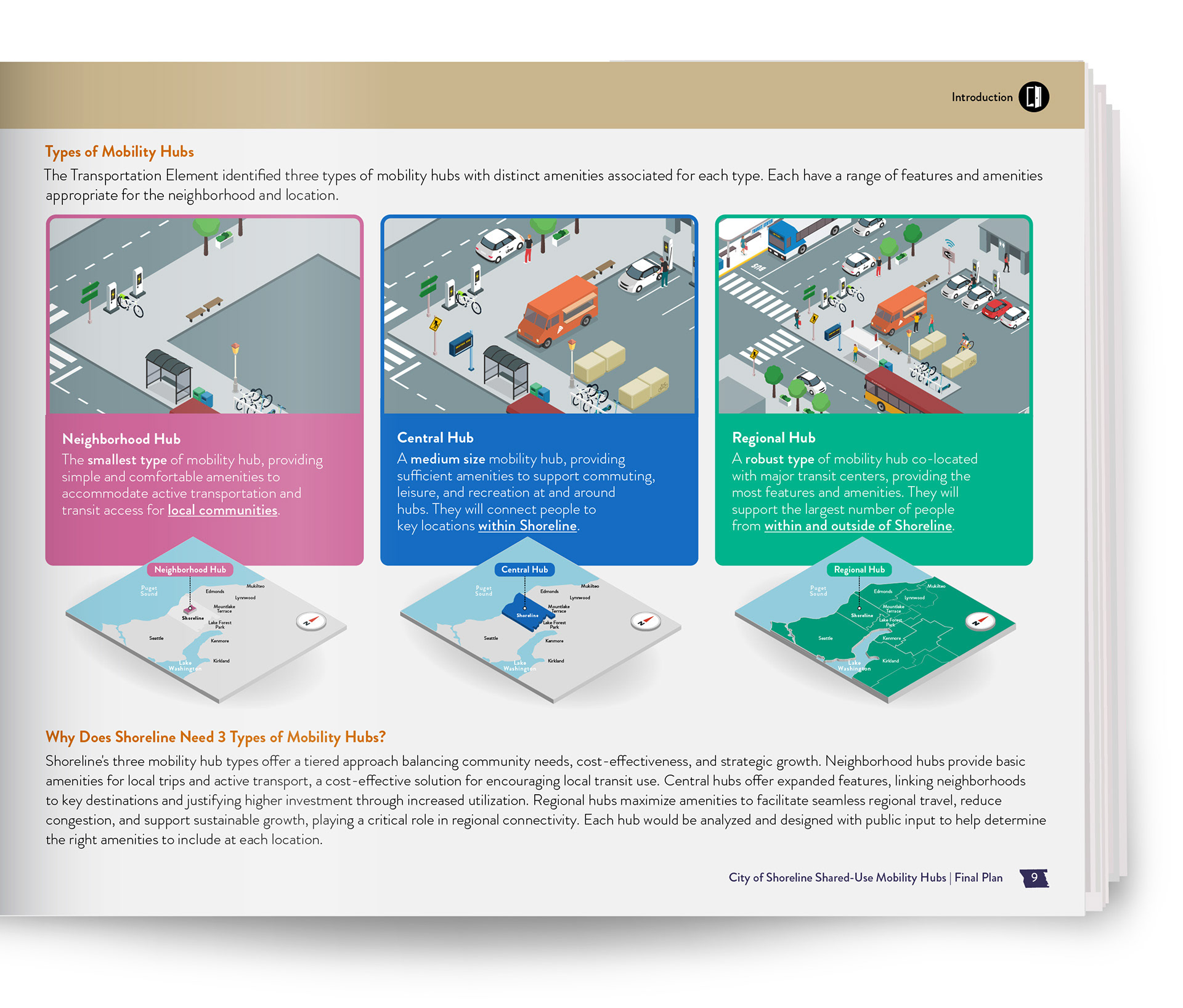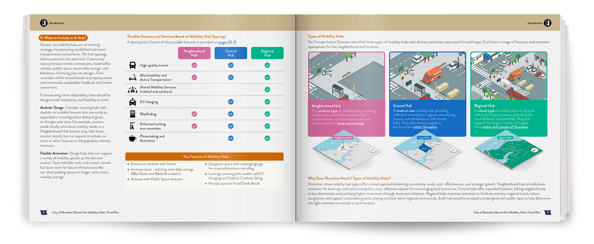 A key part of the plan was visually representing three types of shared-use mobility hubs: Neighborhood, Central, and Regional. Each hub type is tailored to different community needs, from local access to regional connectivity, helping planners apply the right level of investment and infrastructure. I used color-coded text, illustrations, and maps to show how each type is tailored to different parts of the community: