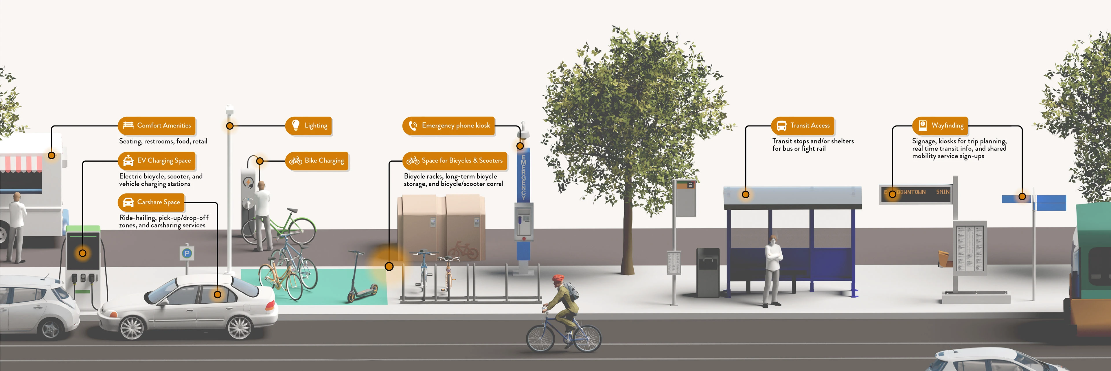 Illustration of a shared-use mobility hub showing how transit, micromobility (bikes & e-scooters), and rideshare vehicles are integrated with amenities to support seamless travel.