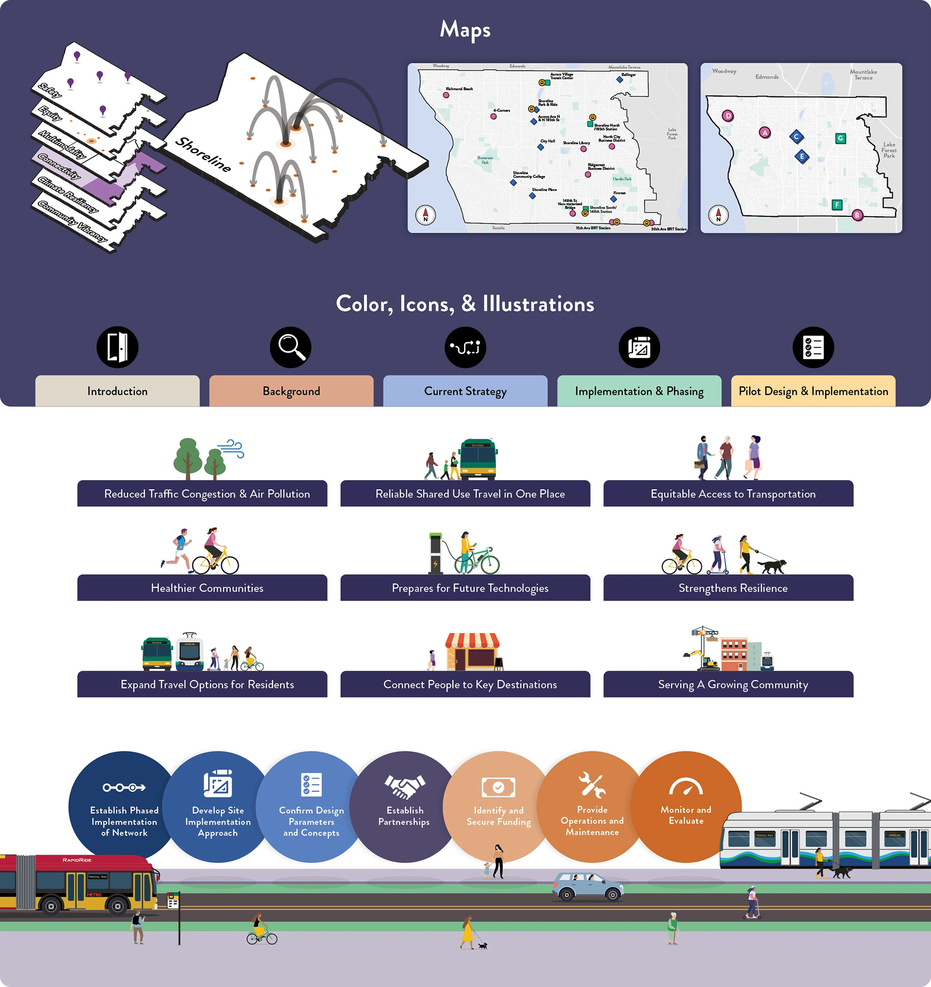 For the City of Shoreline, I designed a visual system that translates this complex, policy-driven concept into clear and approachable guidance for planners and stakeholders. The design challenge was translating the plan’s vision and complexity into a visual story that residents of the Shoreline community can understand and relate to.