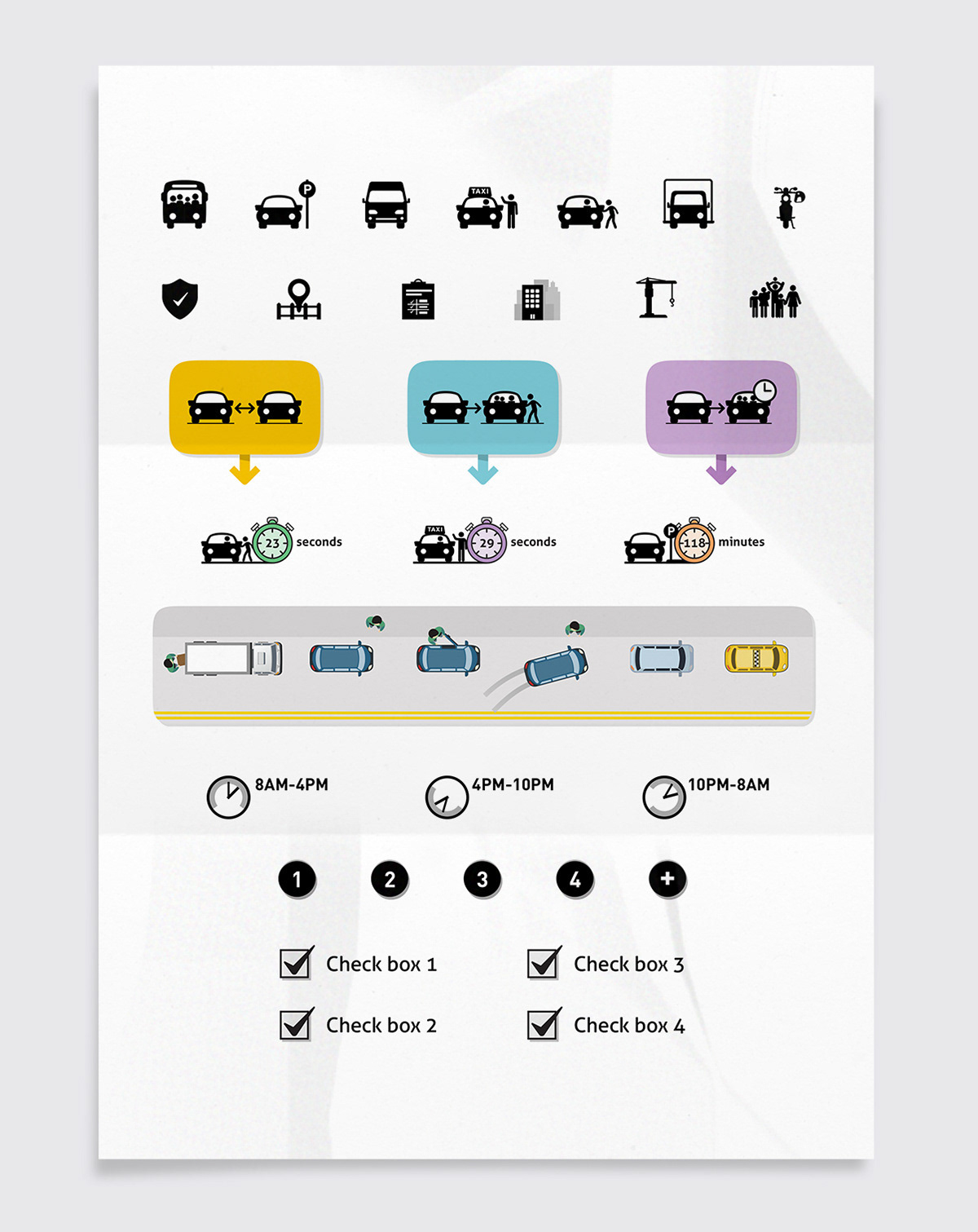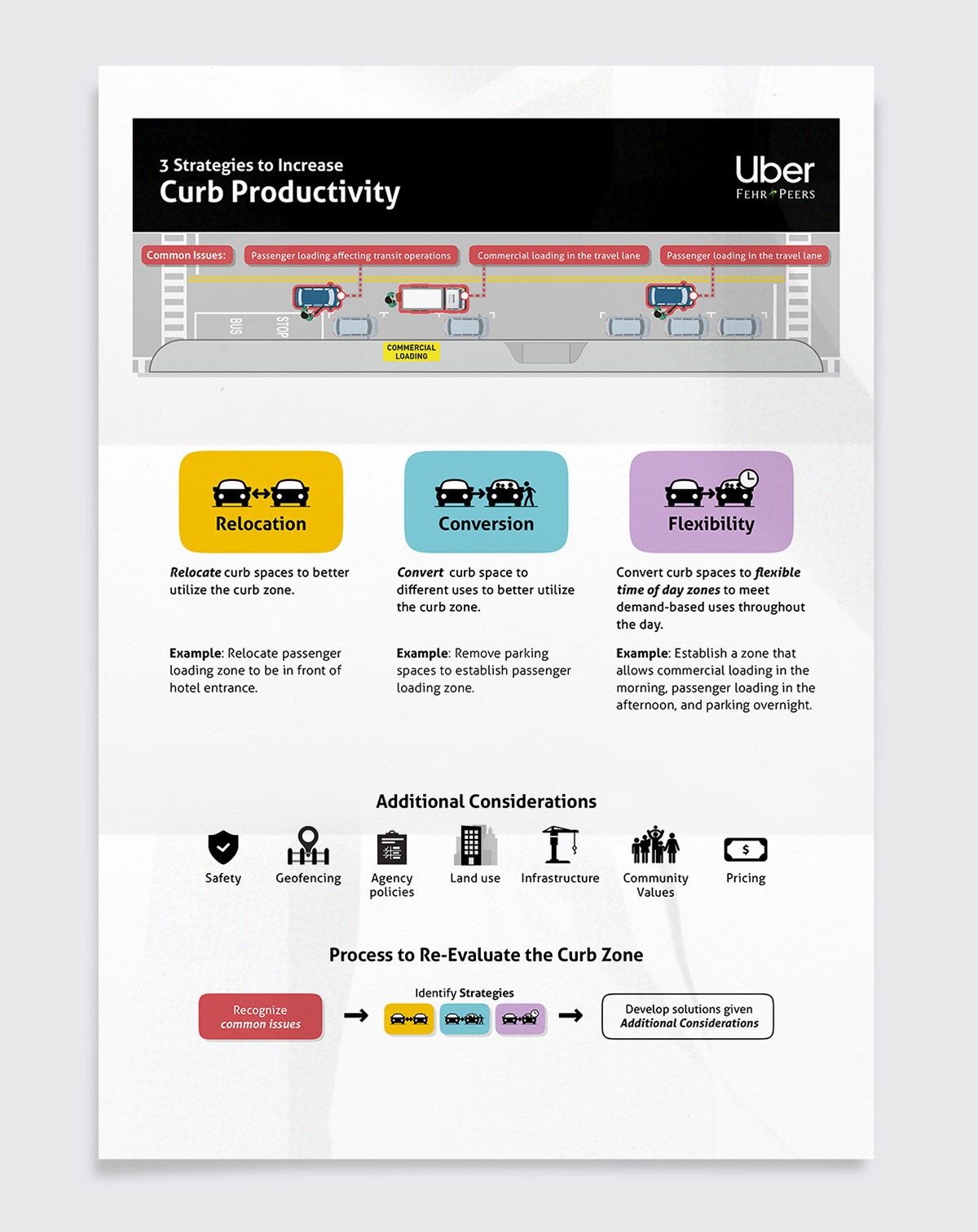 I developed a visual approach to translate these insights into clear, actionable graphics. Working within Uber’s brand guidelines, I designed a set of visuals that communicate common curb challenges and illustrate strategies such as relocation, conversion, and flexible use. The final work supports decision making by helping stakeholders quickly interpret complex data and apply insights to real world conditions.