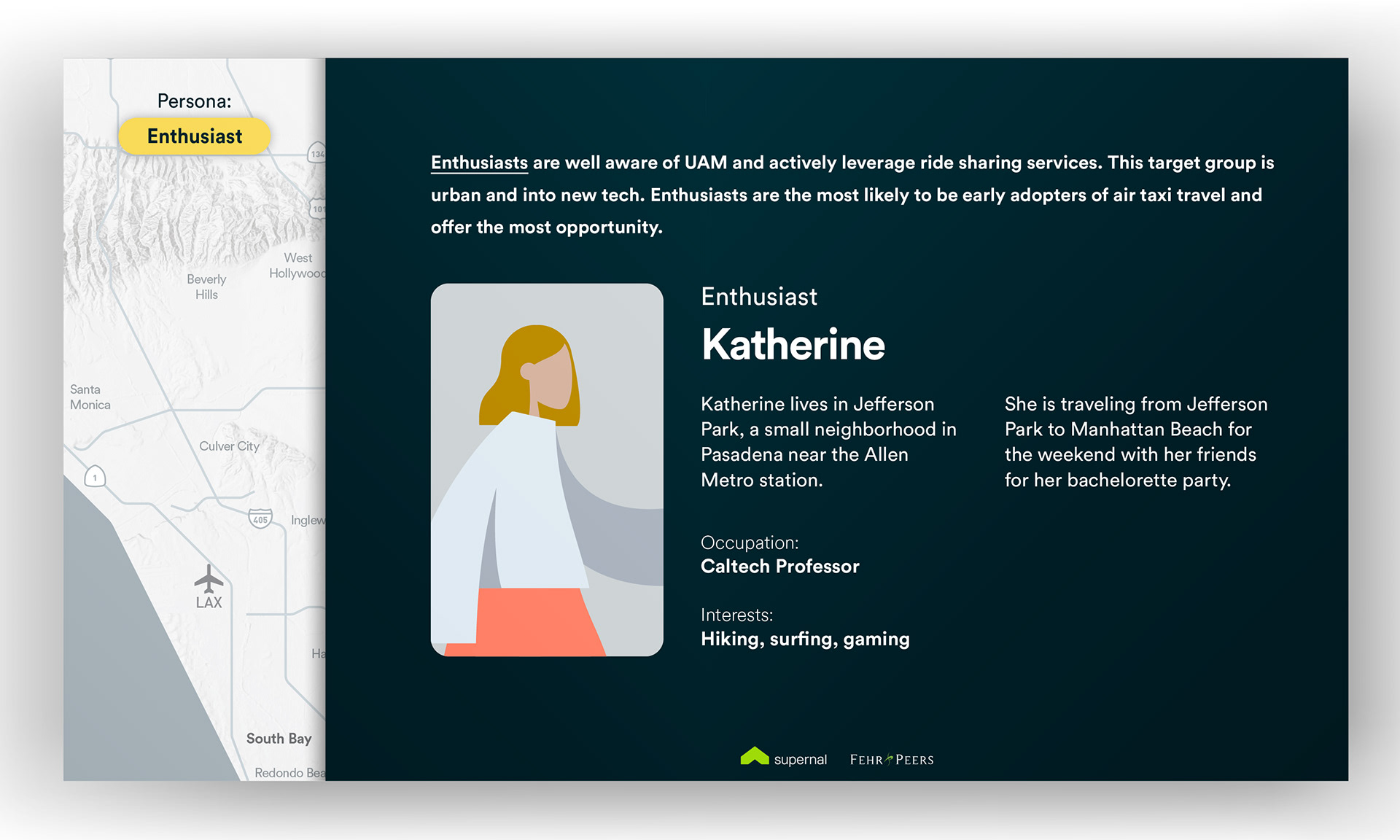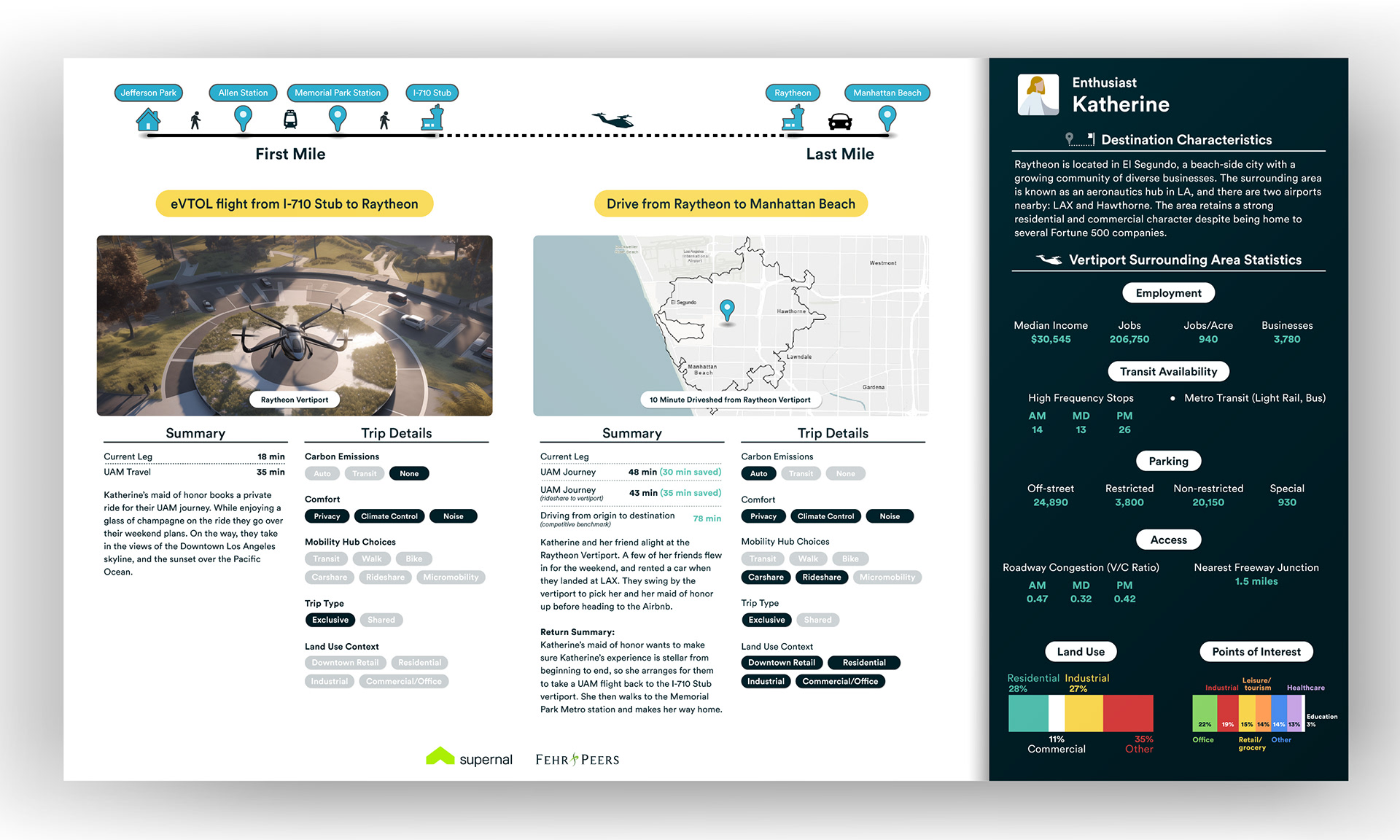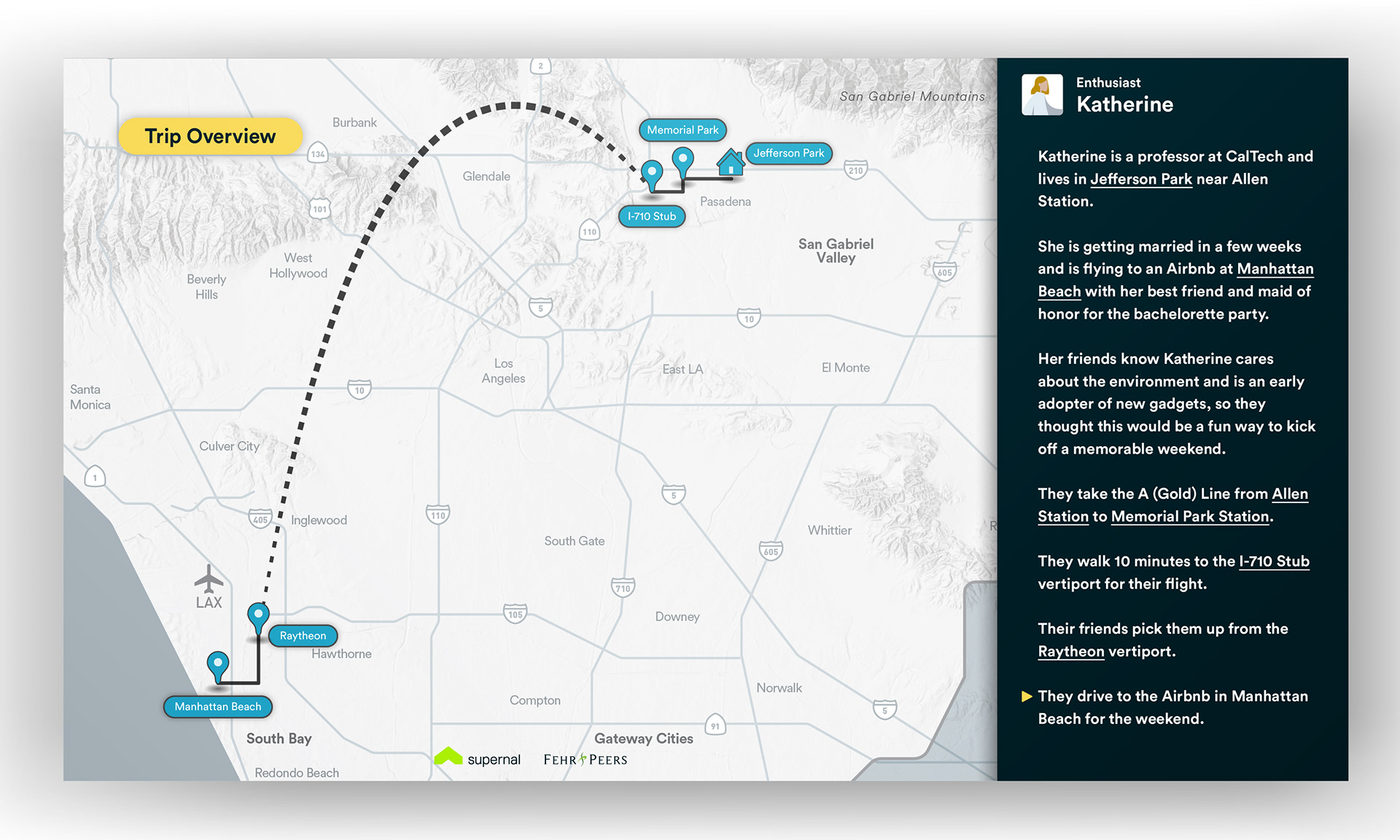 The animated sequence below demonstrates Katherine’s end-to-end eVTOL journey, showing how the visual system communicates each stage from trip planning and first-mile access to vertiport operations and final arrival. The sequence highlights how data, personas, and spatial context are integrated to model real-world travel scenarios and evaluate feasibility across different segments of the journey.