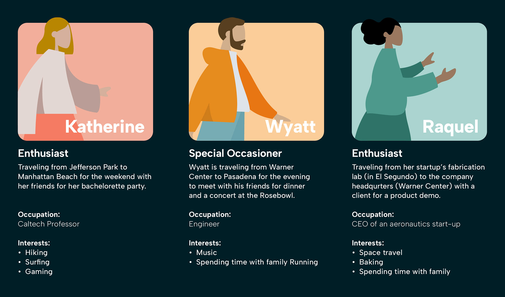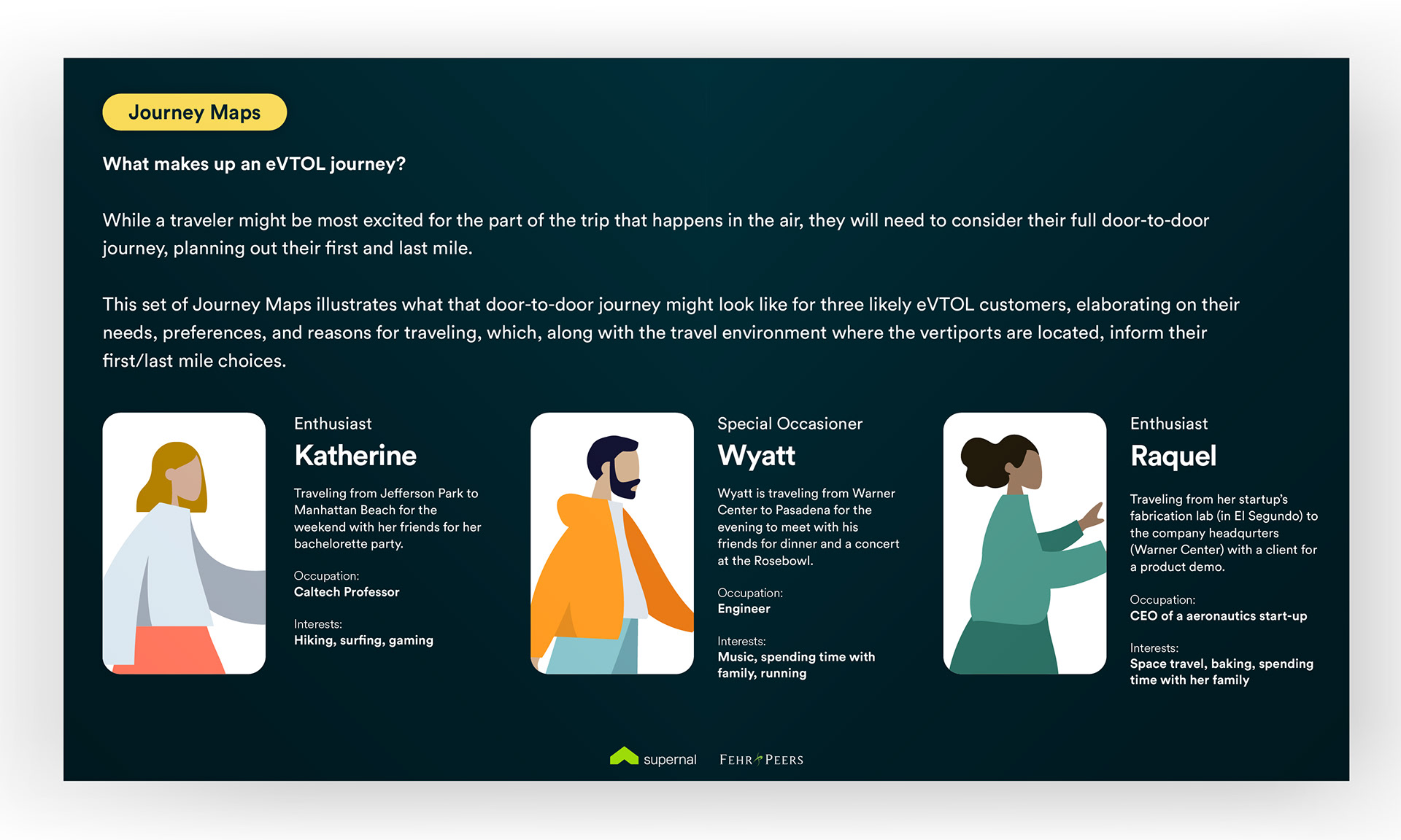 To make the concept more relatable, we created three personas based on market research. These personas represent different travel needs and motivations, helping to test assumptions around first- and last-mile logistics, accessibility, and user behavior. The resulting visuals clarify how eVTOL travel could function in real-world scenarios and support decision making around future infrastructure and service design.